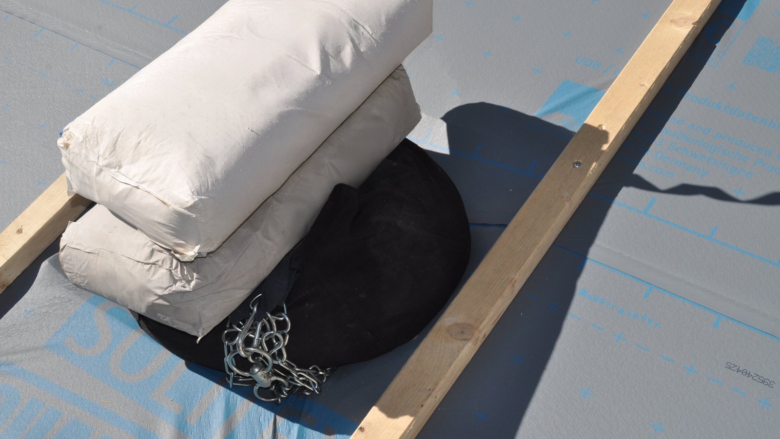 Dieser Fragestellung haben sich GUTEX und pro clima in einem gemeinsamen Projekt angenommen. Für dieses wurden verschiedene Dachaufbauten mit Kombinationen aus Holzfaserunterdachplatten und Unterdachbahnen auf ihre Durchbruchsicherheit hin überprüft. Die Prüfungen wurden auf Grundlage des Suva Factsheets «Durchbruchsichere Dachflächen» und der Prüfrichtlinie GS-BAU-18 des gesetzlichen Unfallversicherers aus Deutschland durchgeführt. Diese fordert einen dynamischen Belastungsversuch (Fallversuch) mit einer Aufprallenergie von 1200 Joule. Dazu wird ein mit 50 kg Vollglaskugeln gefüllter Sack aus einer Höhe von 2,45 m auf den zu prüfenden Dachaufbau fallen gelassen. Widersteht die Konstruktion dieser Einwirkung wird sie für 15 Minuten zusätzlich mit weiteren 50 kg Gewicht belastet. Hält das Bauteil auch dieser Belastung stand gilt der Test als bestanden – die Konstruktion ist ausreichend durchbruchsicher. Alle Aufbauten wurden ohne Zwischensparrendämmung und ohne Innenverkleidung geprüft.