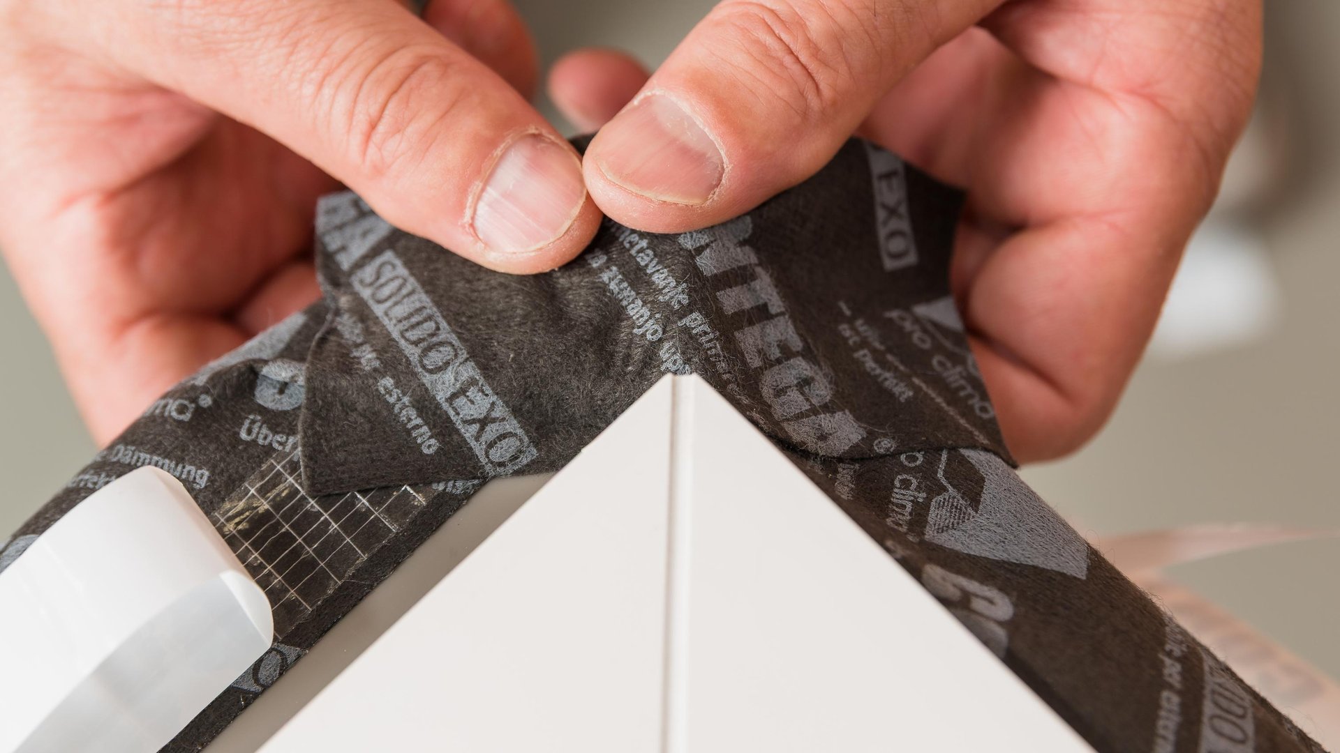 Damit das Band später einfach und sicher in der Fensterleibung verklebt werden kann, Eckfalten herstellen.