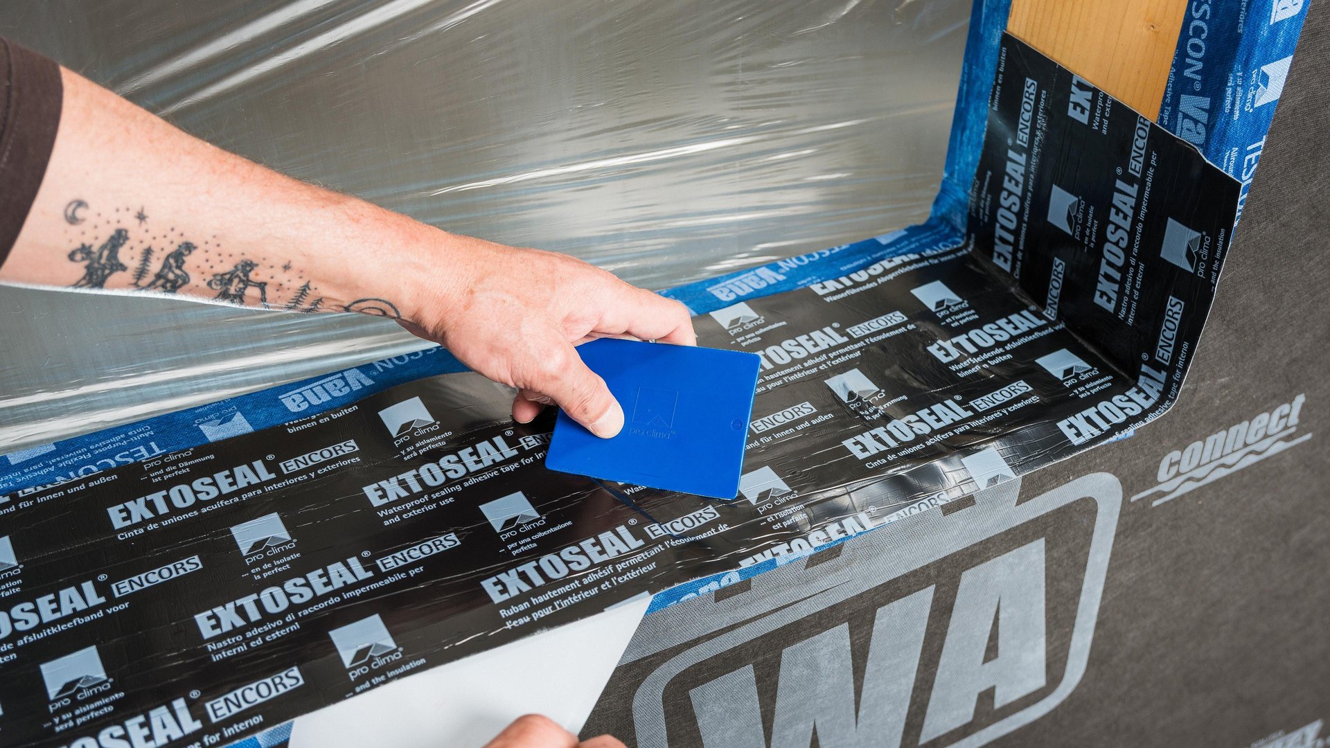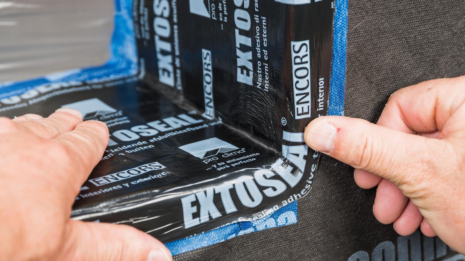 EXTOSEAL ENCORS in der Fläche verkleben, mindestens bis zur Innenkante des Fensterprofils, bei Erfordernis in der gesamten Bauteiltiefe.