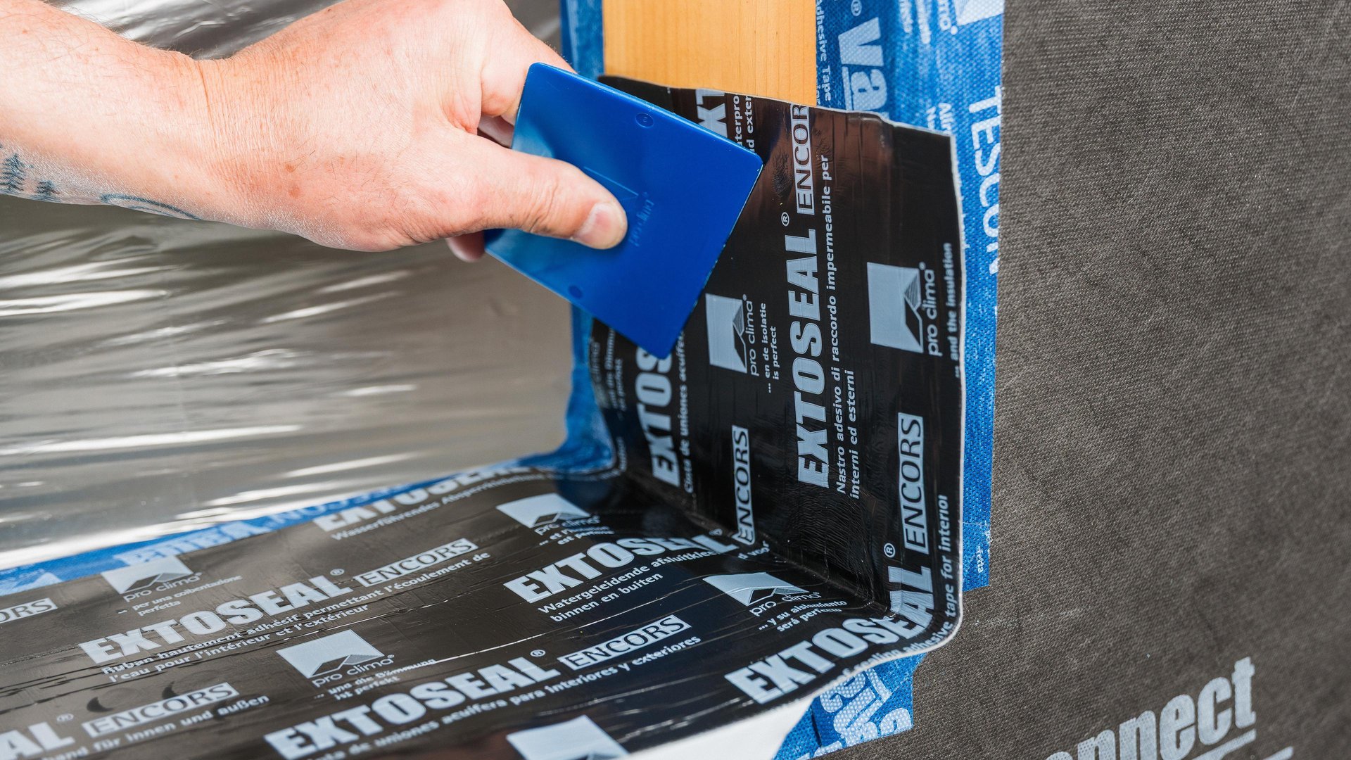 Bei hinterlüfteter Fassade das Klebeband im Eckbereich (ohne Schädigung) überdehnen und auf geeignetem Untergrund, z. B. SOLITEX FRONTA WA, verkleben.