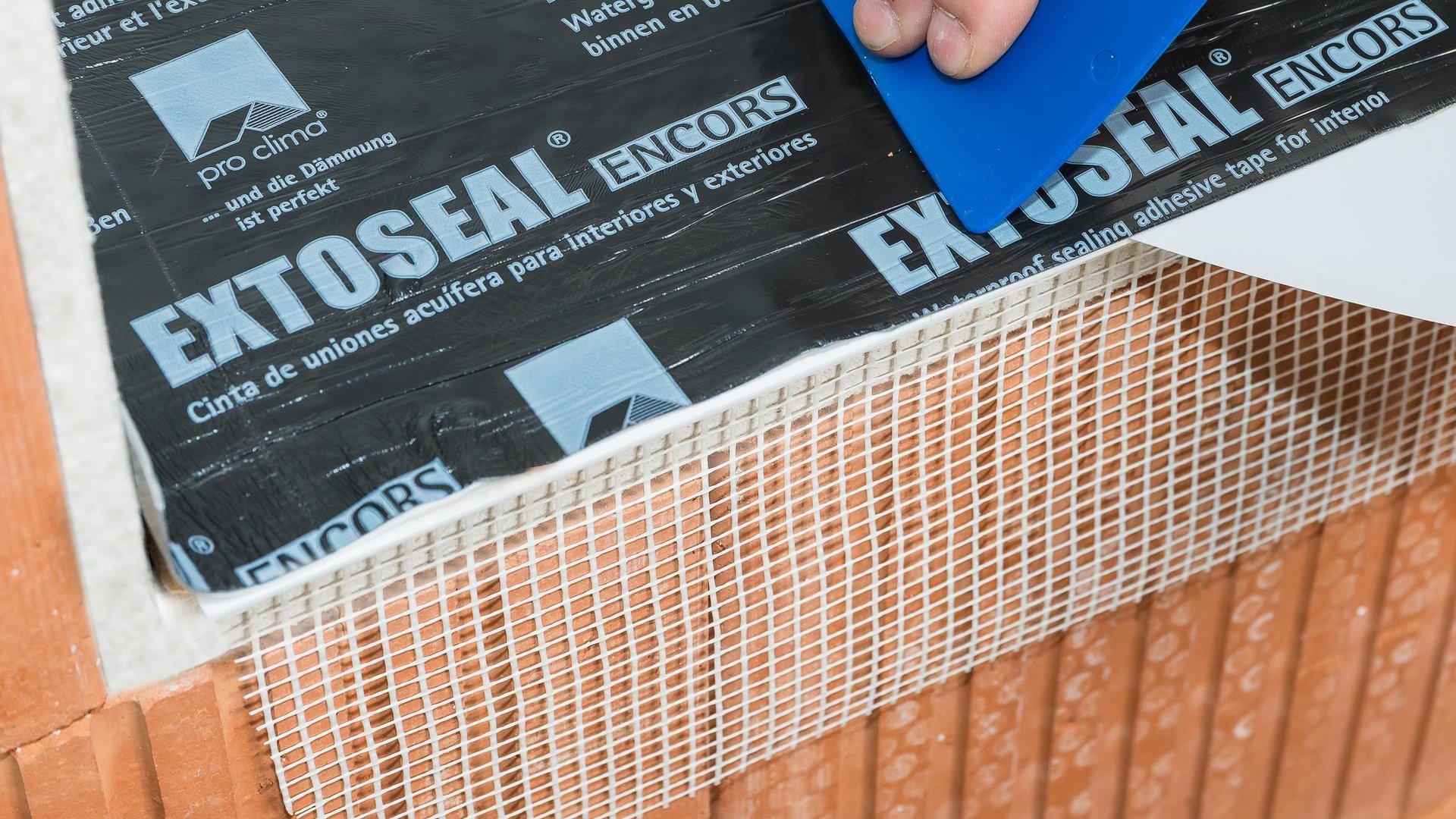 EXTOSEAL ENCORS in der Fläche verkleben, mindestens bis zur Innenkante des Fensterprofils, bei Erfordernis in der gesamten Bauteiltiefe.