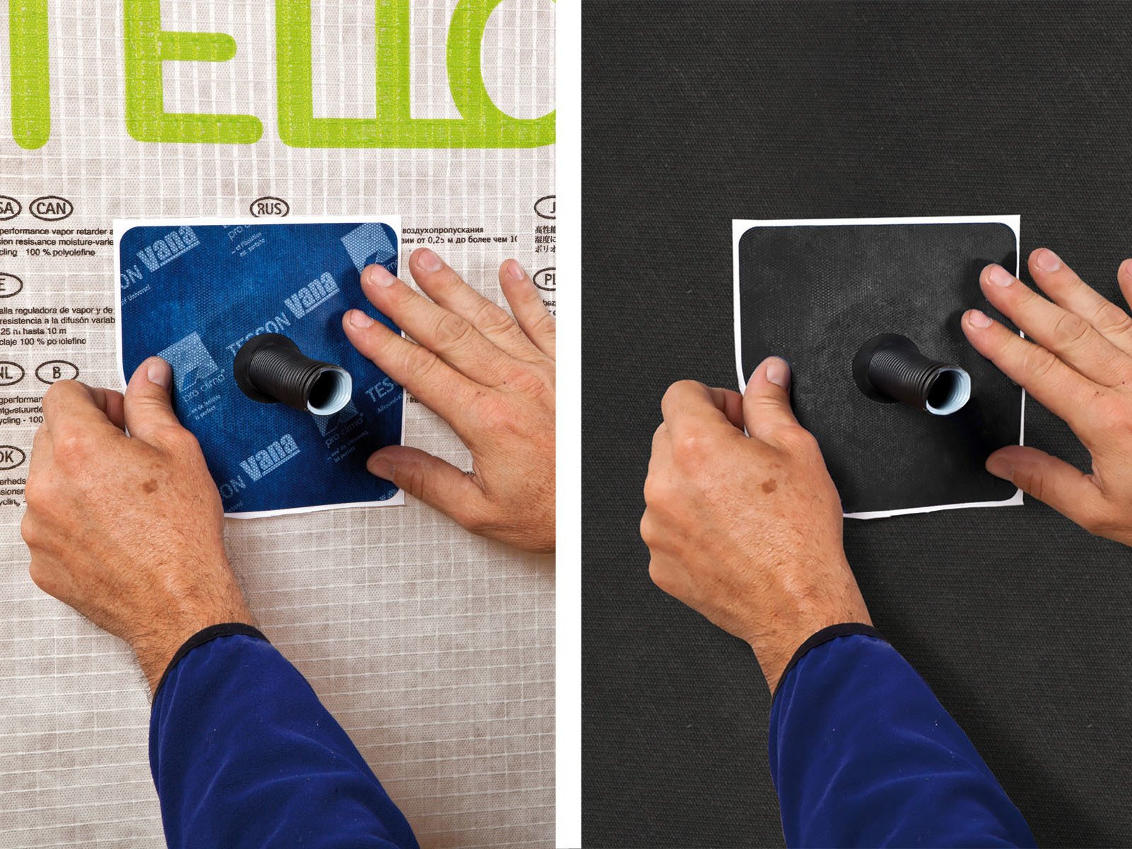 Die schwarze Manschette ist entwickelt für Lückenschalung auf schwarzer Fassadenbahn: SOLITEX FRONTA Linie.