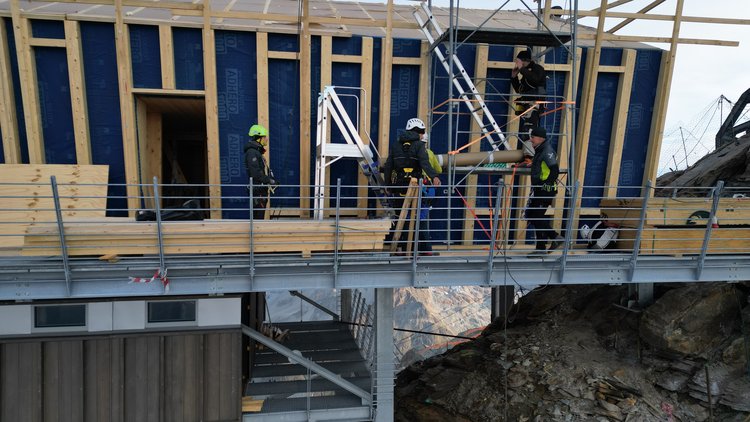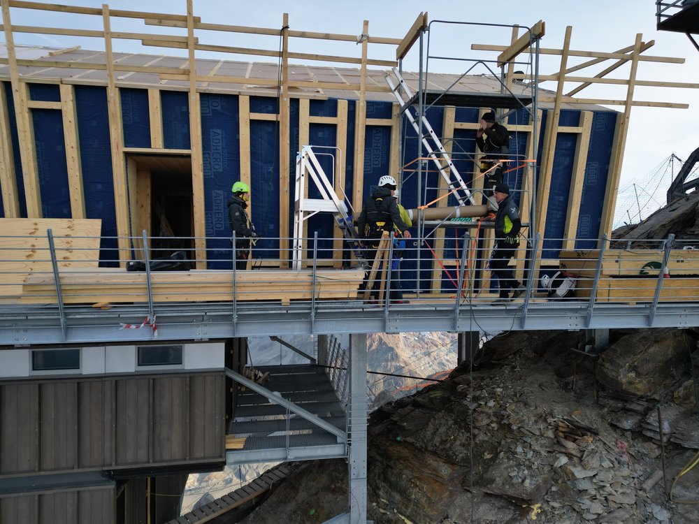 Auf die geschützte Holzkonstruktion wurde die Wärmedämmung verlegt und abschliessend eine äussere Metallverkleidung aufgebracht. Das System vereint damit Vorfertigung, Präzision und Dauerhaftigkeit unter extremen alpinen Bedingungen.