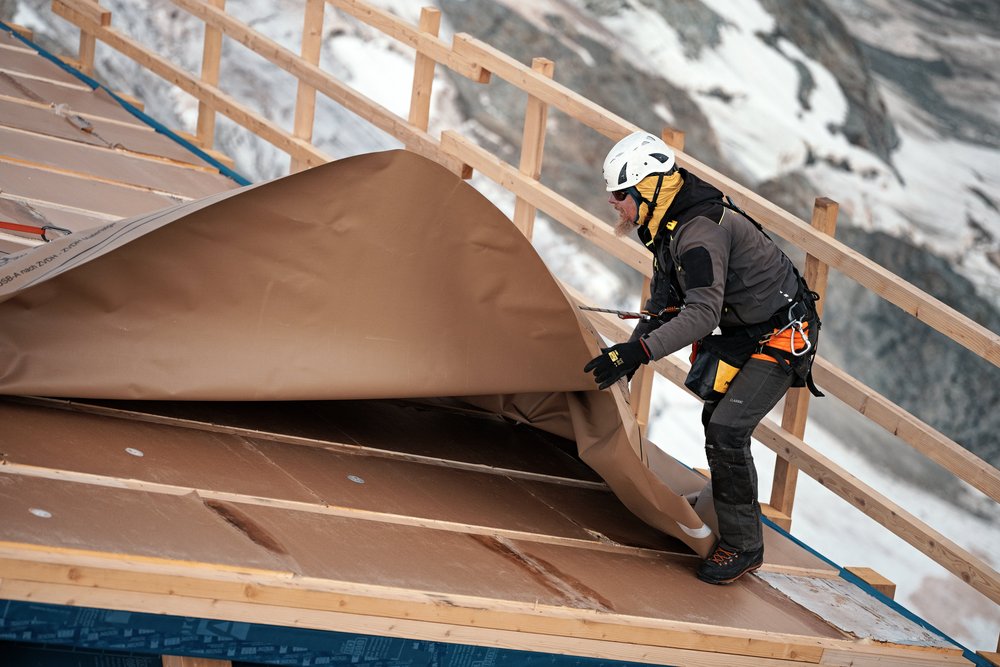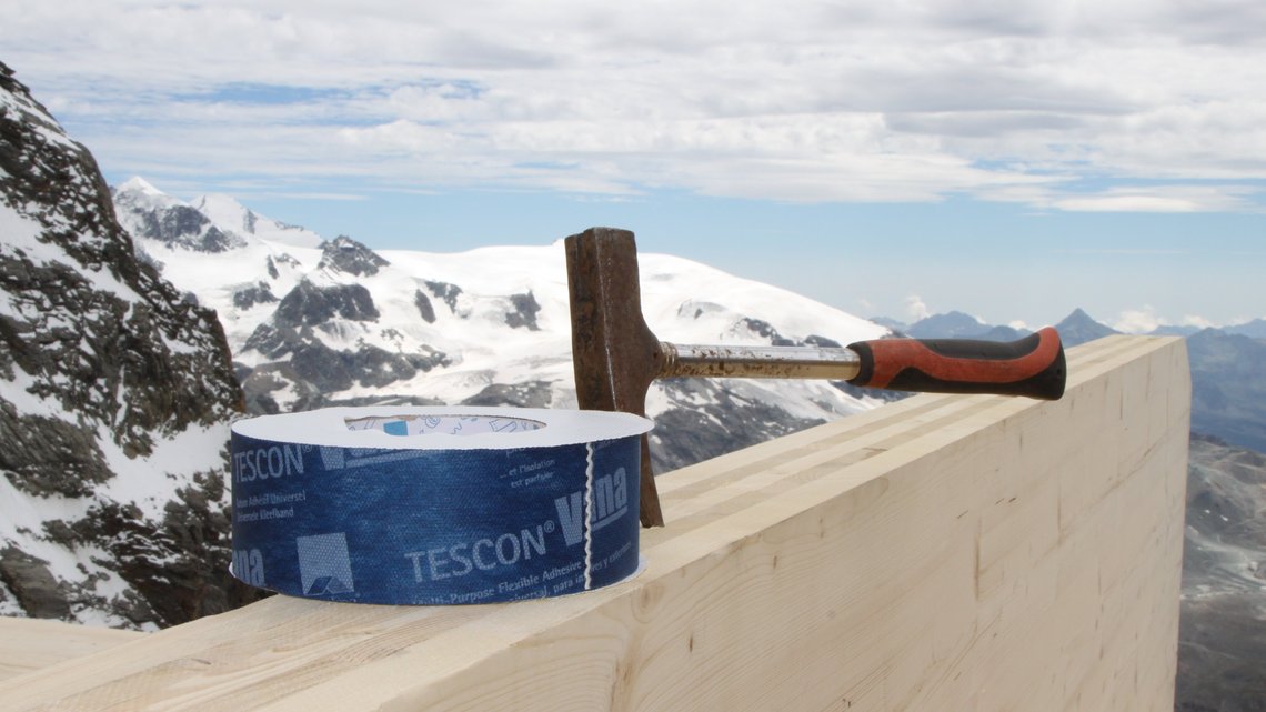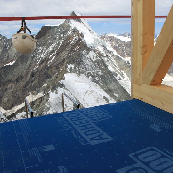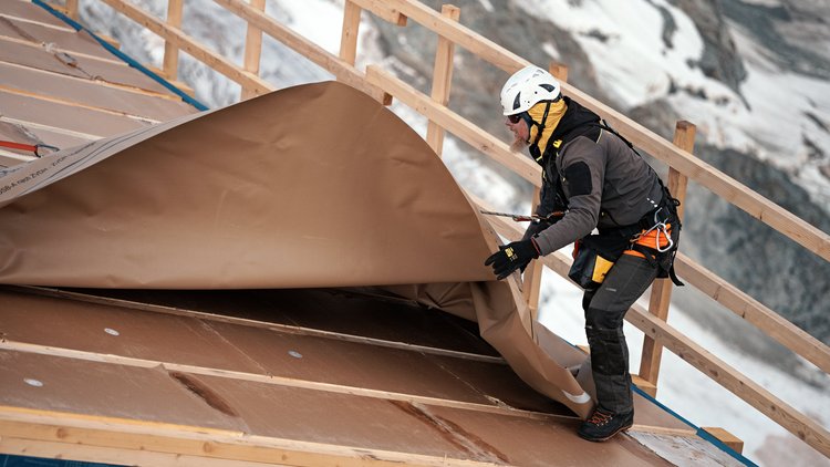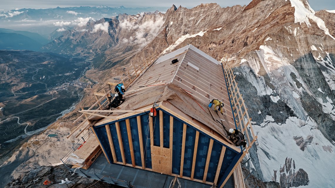 Durch das Aufbringen der Witterungsschutzbahn konnte bereits in der Montagephase ein hoher Feuchte- und Witterungsschutz gewährleistet werden – ein entscheidender Faktor bei einer Baustelle auf 3.830 Metern Höhe am Südgrat des Matterhorn.