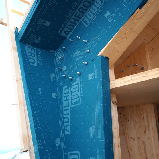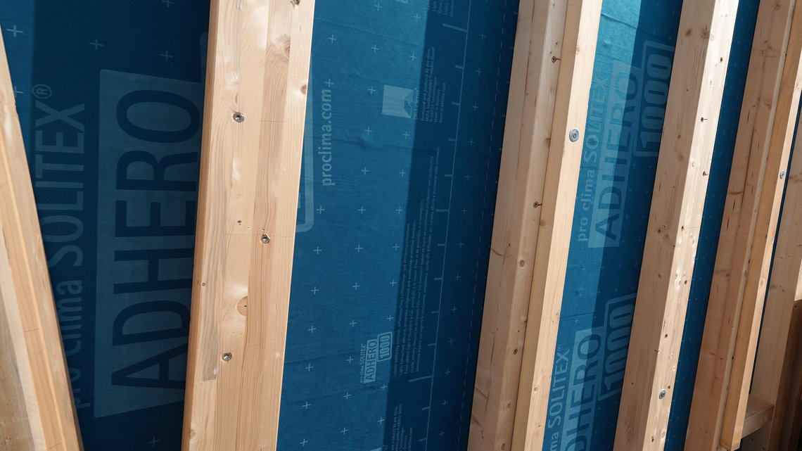 Ein wesentliches Detail der Ausführung war der Schutz der Holzelemente bereits vor der Montage: Die Aussenflächen wurden mit SOLITEX ADHERO 1000 vorab geschützt, noch bevor die Wärmedämmung und die äussere Metallverkleidung angebracht wurden.
