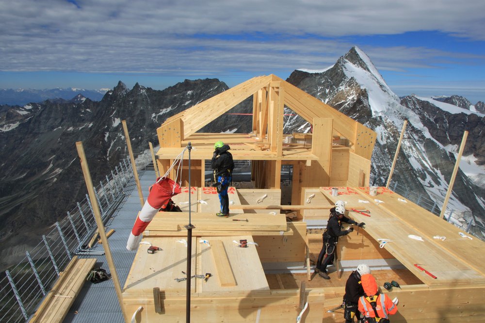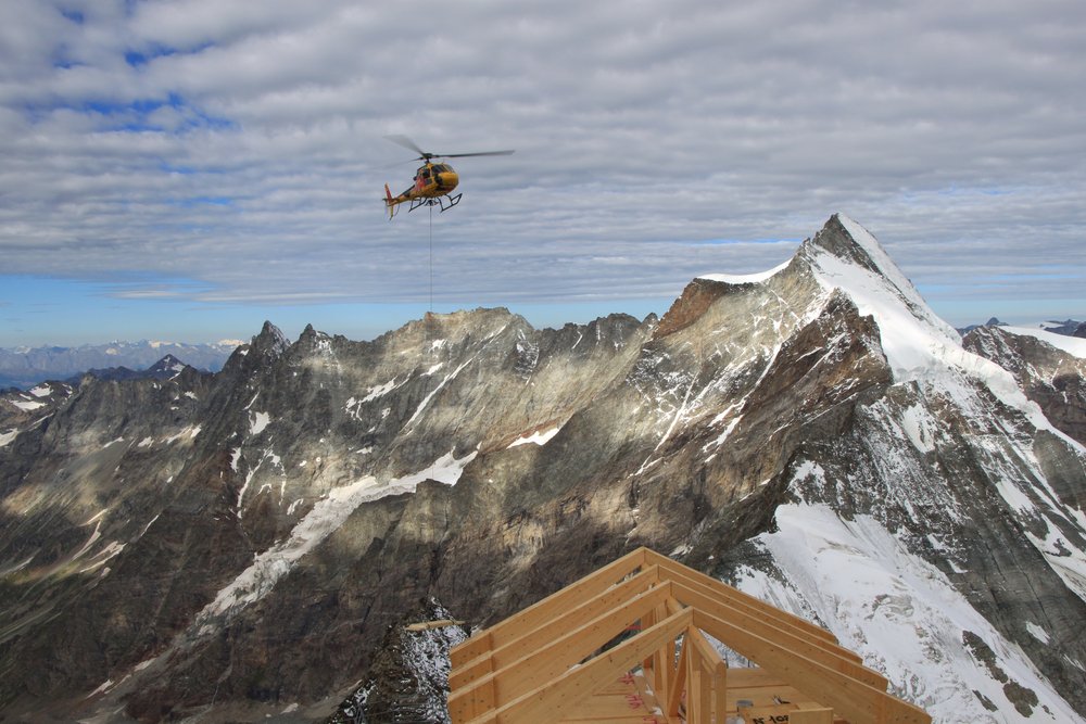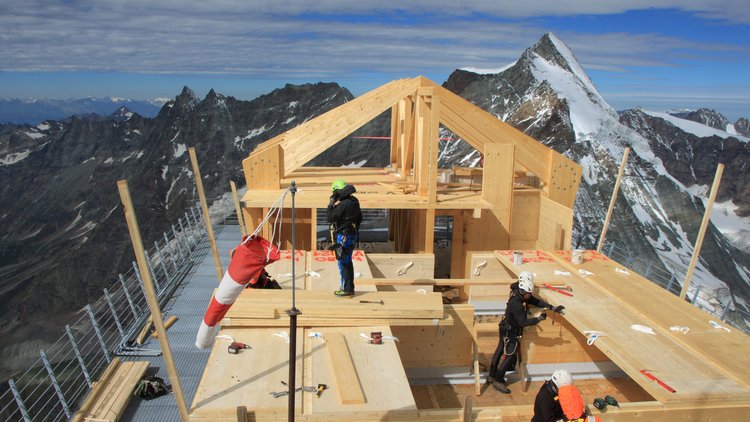 Der Aufbau selbst besteht aus einer massiven Holzkonstruktion deren Elemente im Tal vorgefertigt und anschliessend per Helikopter in die Höhe transportiert wurden.